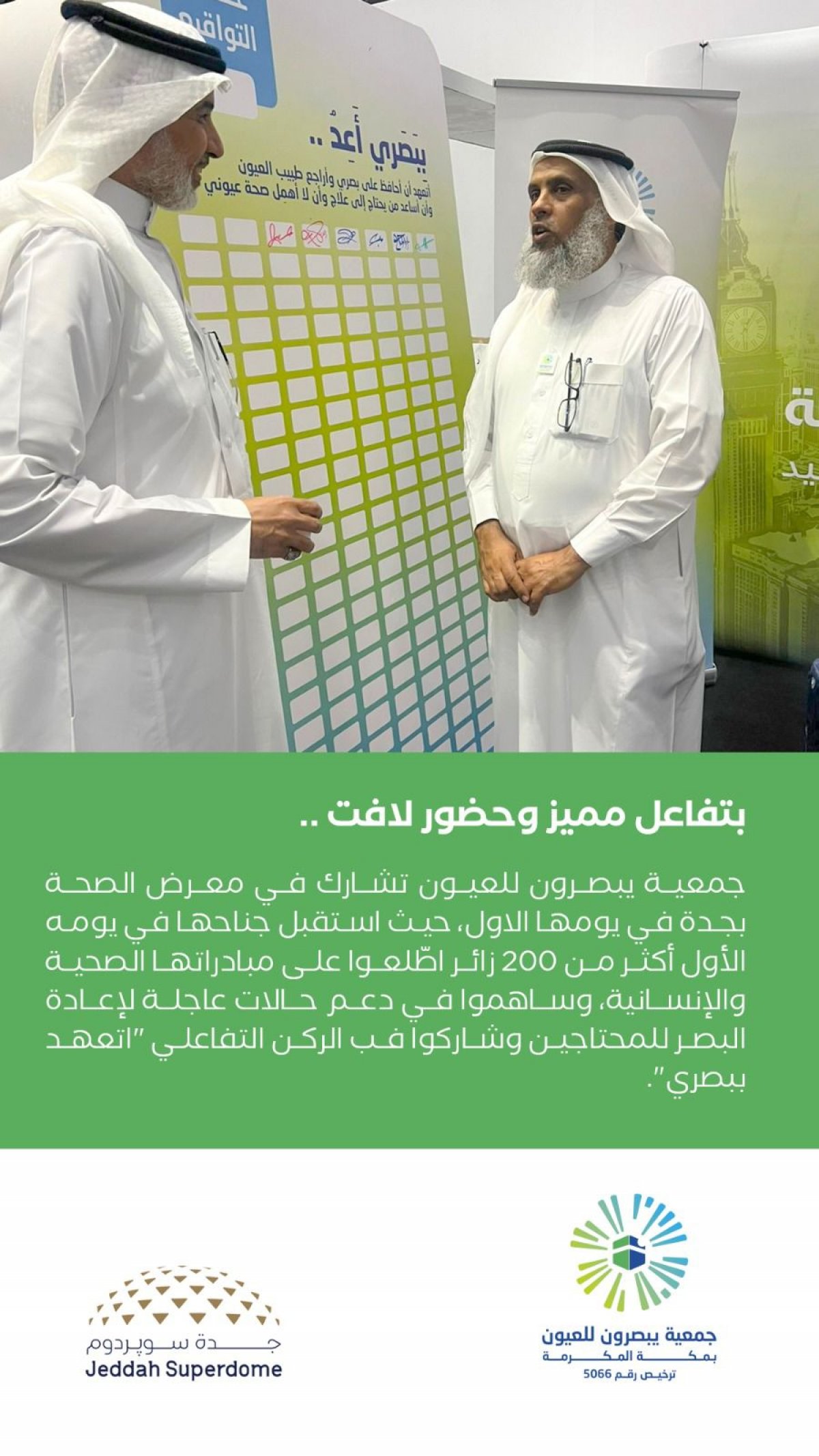 جمعية يبصرون للعيون تشارك في معرض الصحة بجدة في يومها الأول، حيث استقبل جناحها في يومه الأول أكثر من ٢٠٠ زائر اطّلعوا على مبادراتها الصحية والإنسانية