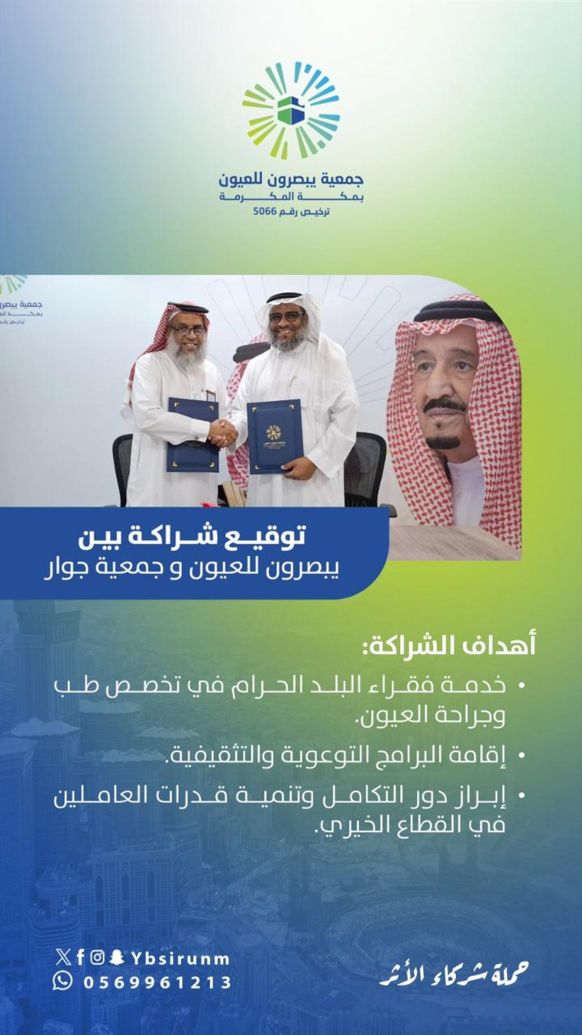 يسرنا توقيع شراكة نوعية بين جمعية يبصرون للعيون و جمعية جوار لخدمة فقراء البلد الحرام في مجال طب وجراحة العيون