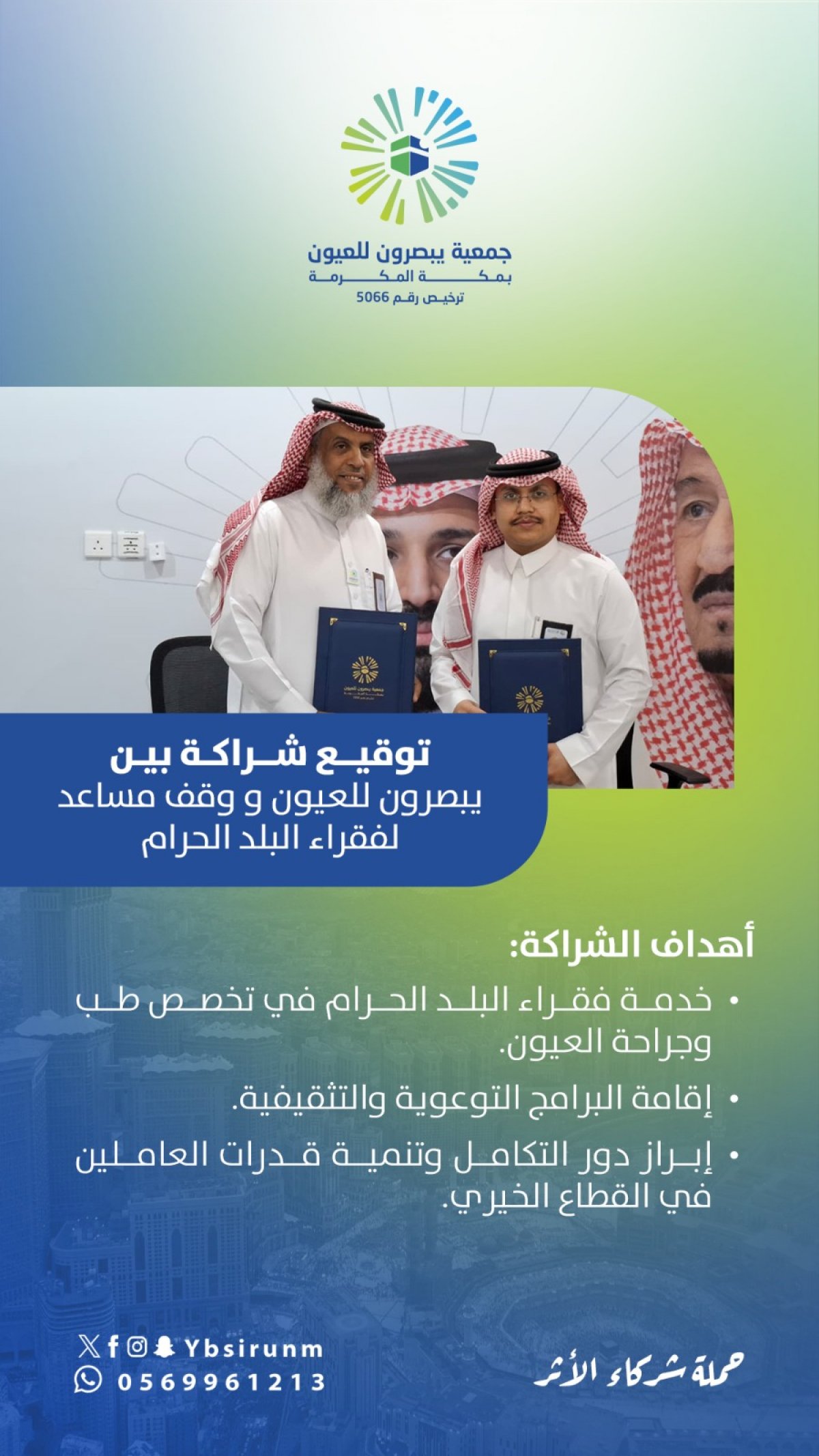 وقّعت جمعية يبصرون للعيون بمكة المكرمة اتفاقية شراكة مع وقف مساعد لخدمة فقراء البلد الحرام
