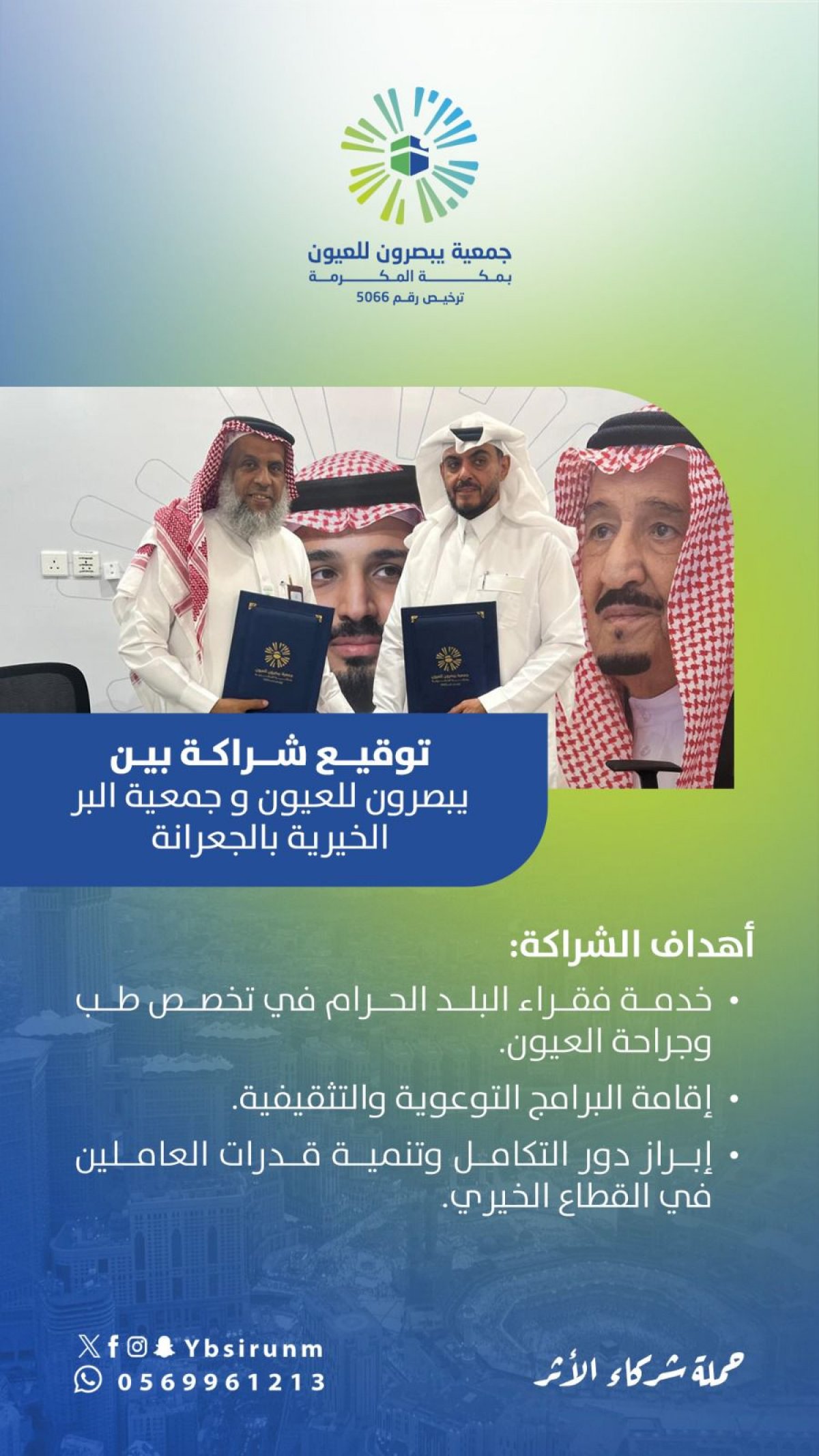 في إطار تعزيز العمل الخيري المشترك وخدمة فقراء البلد الحرام، وقّعت جمعية يبصرون للعيون اتفاقية شراكة مع جمعية البر الخيرية بالجعرانة